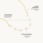A dance of lustrous pearls. This delicate chain is adorned with dainty pearls that mimic the gentle flow of the ocean. Perfect for wearing alone for understated elegance or layering with other necklaces for a modern twist.
