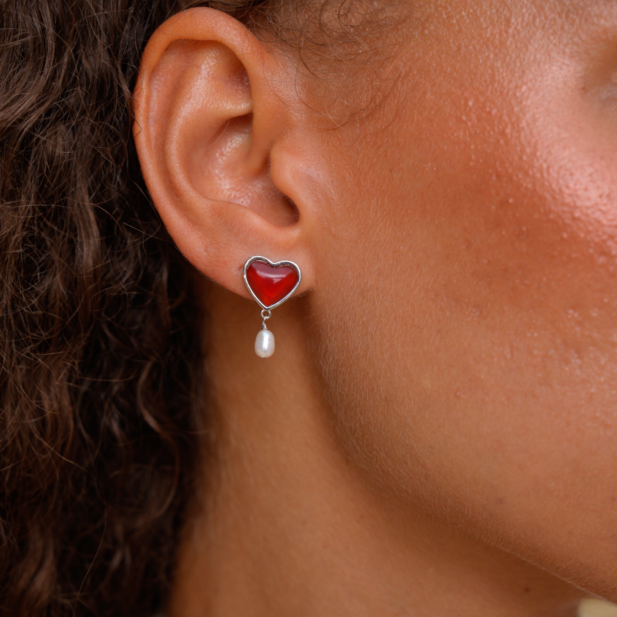 Inspired by the goddess of love, these feminine heart earrings lead you into a gentle love affair. Featuring a ruby heart silhouette with dangling feminine pearls, layer them with ocean motifs or the matching bracelet and ring for a complete romantic look.