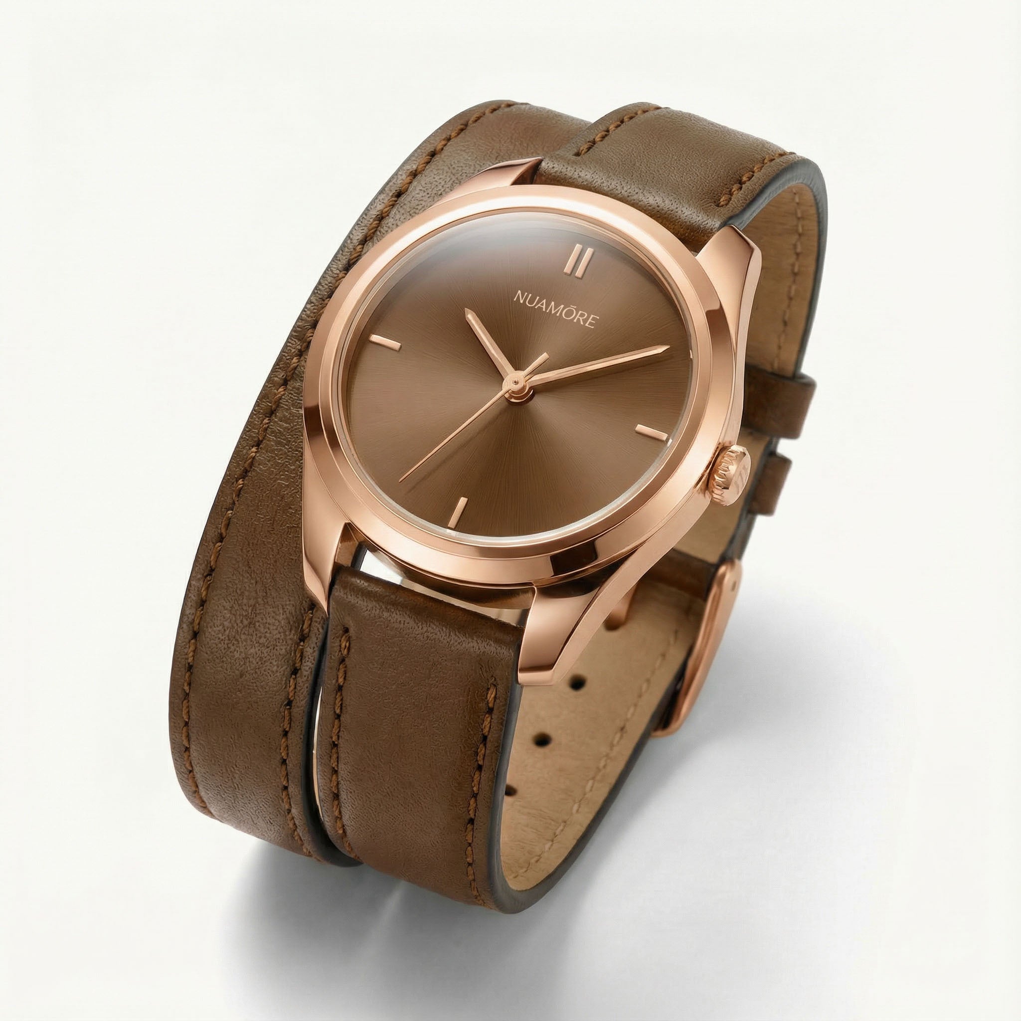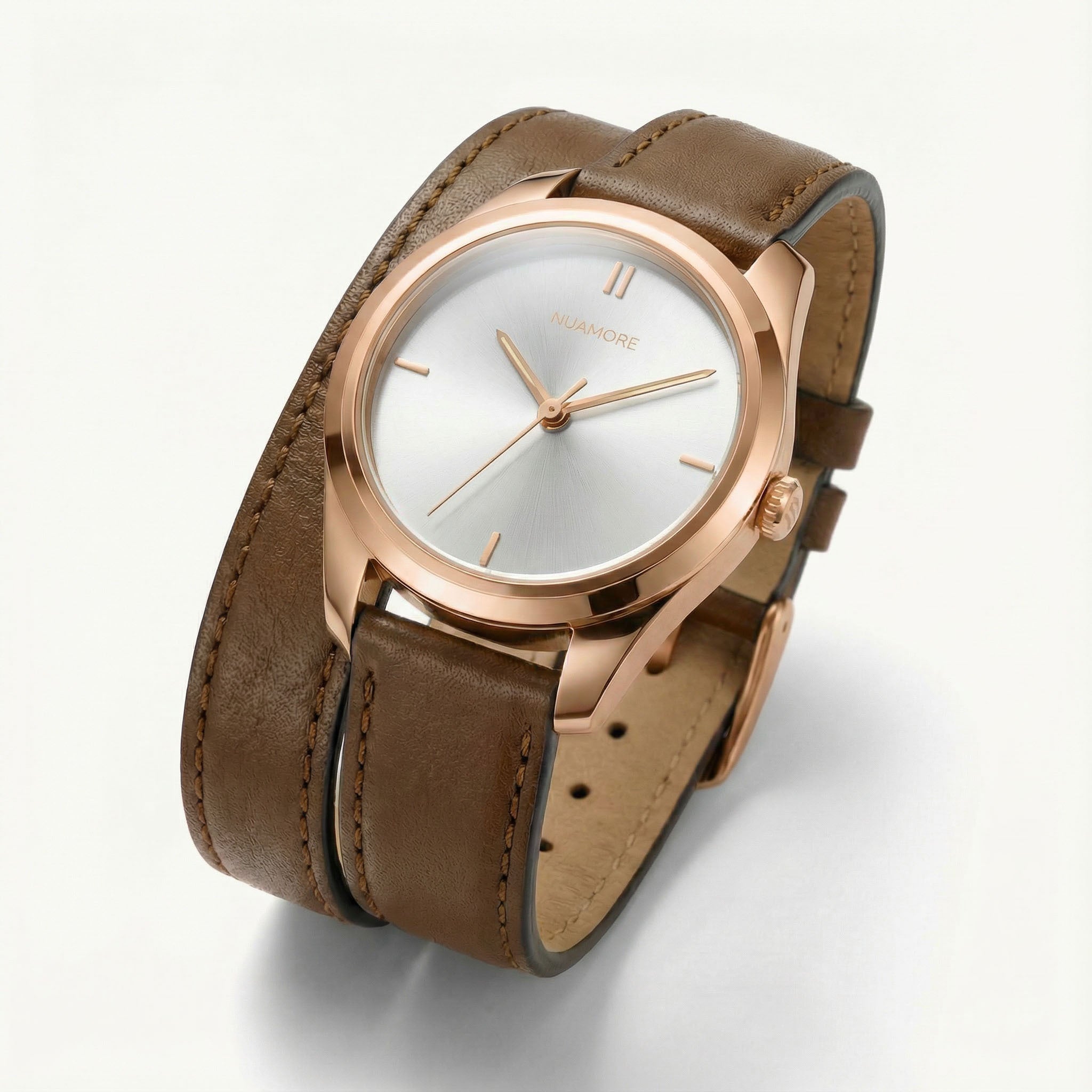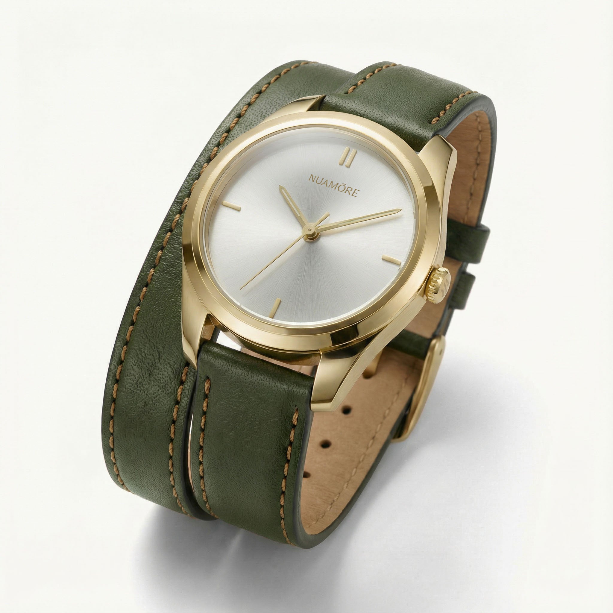 Designed for women who feel most alive in motion, the Nomade Watch is made to move with you, from early hikes to long walks, quiet escapes, and everyday adventures. Its layered leather strap feels soft and familiar from the first wear, while the earthy tones and clean dial keep the look grounded and effortless.
