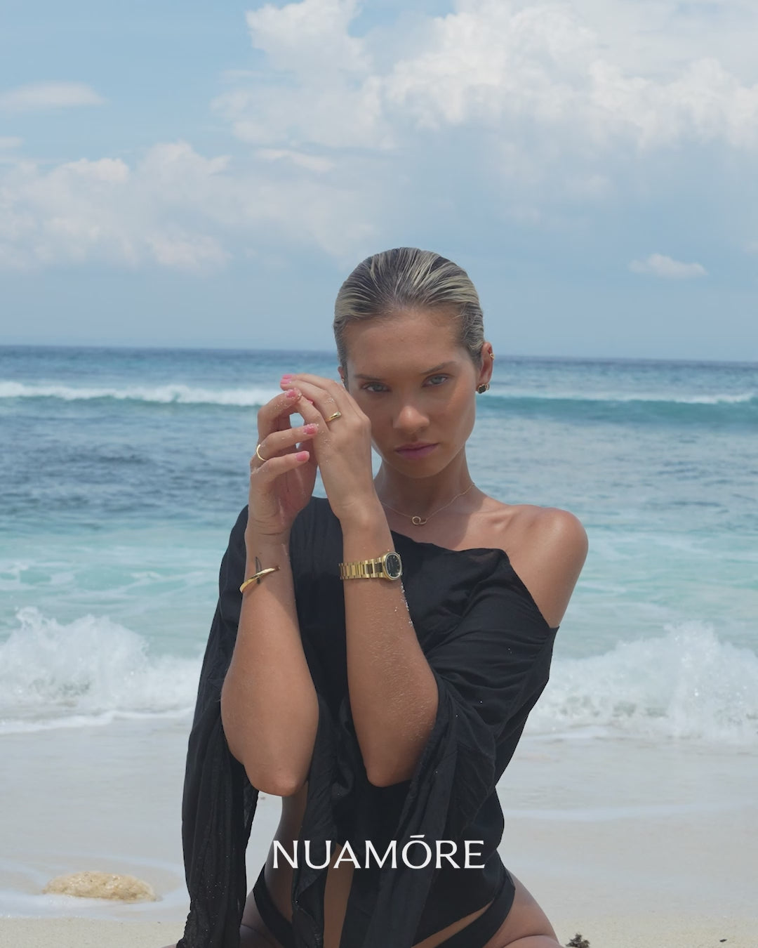 Mit fließenden Bewegungen, glitzernden Oberflächen und mutigen, aber femininen Silhouetten umhüllt Nuamore Sie mit modernem Witz.