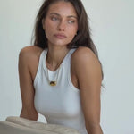 The Aurelle Necklace is a rounded, 18k Gold polished pendant strung on a delicate chain. A sculptural piece that transitions seamlessly from day to night.
